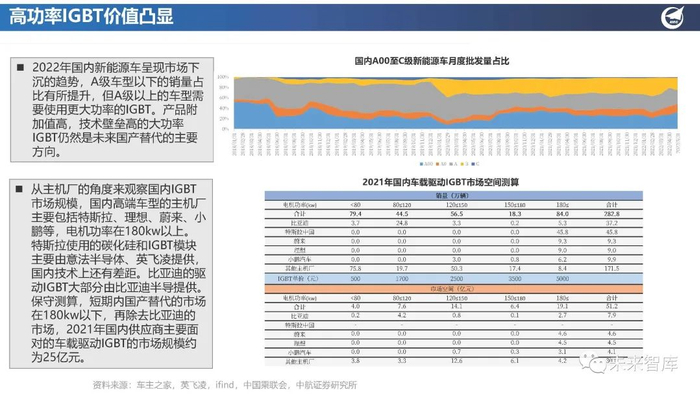 2022年国内新能源车呈现市场下 沉的趋势,A级车型以下的销量占 比有所提升,但A级以上的车型需 要使用更大功率的IGBT。产品附 加值高,技术壁垒高的大功率 IGBT仍然是未来国产替代的主要 方向。