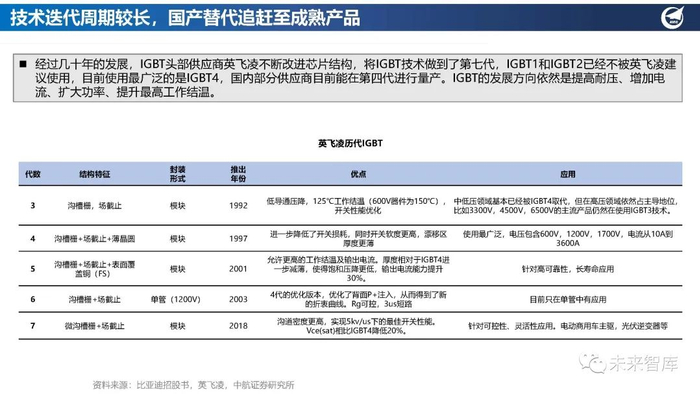 经过几十年的发展,IGBT头部供应商英飞凌不断改进芯片结构,将IGBT技术做到了第七代,IGBT1和IGBT2已经不被英飞凌建 议使用,目前使用最广泛的是IGBT4,国内部分供应商目前能在第四代进行量产。IGBT的发展方向依然是提高耐压、增加电 流、扩大功率、提升最高工作结温。