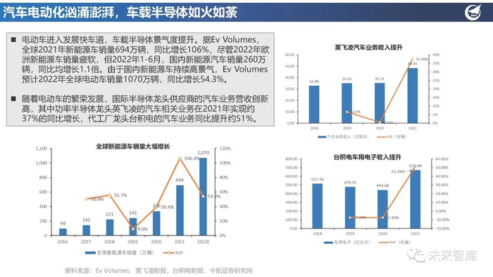 随着电动车的繁荣发展,国际半导体龙头供应商的汽车业务营收创新 高,其中功率半导体龙头英飞凌的汽车相关业务在2021年实现约 37%的同比增长,代工厂龙头台积电的汽车业务同比提升约51%。