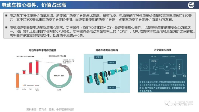 电机和逆变器是电动车新增核心需求,功率器件(IGBT和碳化硅MOS)是逆变器核心器件,也是车辆性能的主要保证方式之 一。和计算机上处理数字信号的CPU类似,功率器件是电动车在功率上的“CPU”。CPU依靠软件实现信号流在0和1之间转换。功率器件依靠变频控制软件,处理功率流的开和关。