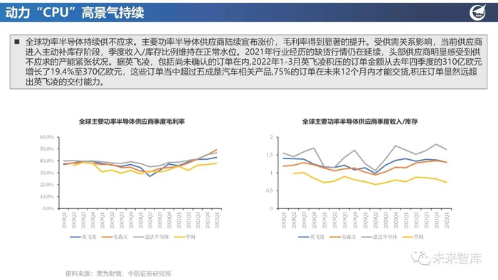全球功率半导体持续供不应求。主要功率半导体供应商陆续宣布涨价,毛利率得到显著的提升。受供需关系影响,当前供应商 进入主动补库存阶段,季度收入/库存比例维持在正常水位。2021年行业经历的缺货行情仍在延续,头部供应商明显感受到供 不应求的产能紧张状况。据英飞凌,包括尚未确认的订单在内,2022年1-3月英飞凌积压的订单金额从去年四季度的310亿欧元 增长了19.4%至370亿欧元,这些订单当中超过五成是汽车相关产品,75%的订单在未来12个月内才能交货,积压订单显然远超 出英飞凌的交付能力。