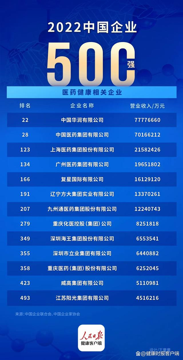 中国企业500强名单公布,13家医药健康相关企业上榜