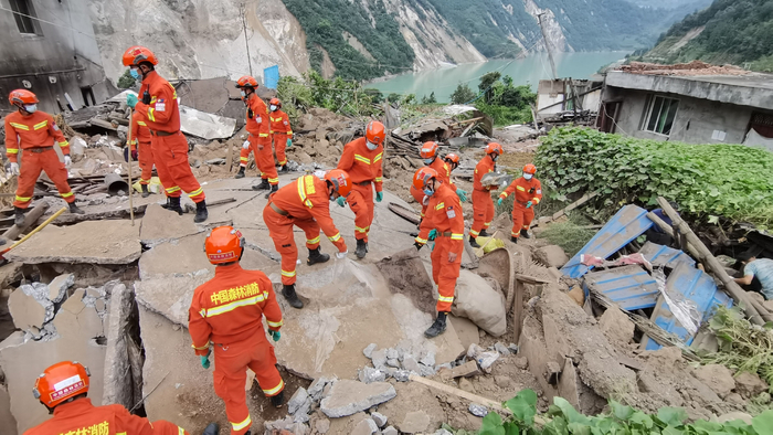 9月6日10时30分,接爱国村群众线索,一栋倒塌建筑物下埋有两名人员,森林消防支队人员正在进行搜救。本文图片 攀枝花森林消防支队供图