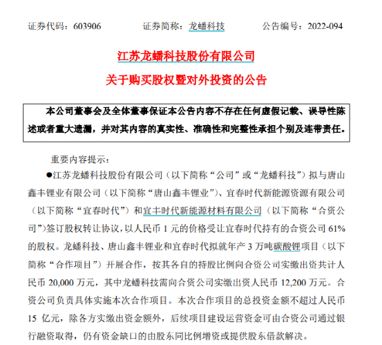 根据公告,9月7日,龙蟠科技、唐山鑫丰锂业、宜春时代和宜丰时代在福建宁德签订了《关于宜丰时代新能源材料有限公司之股权转让协议》。
