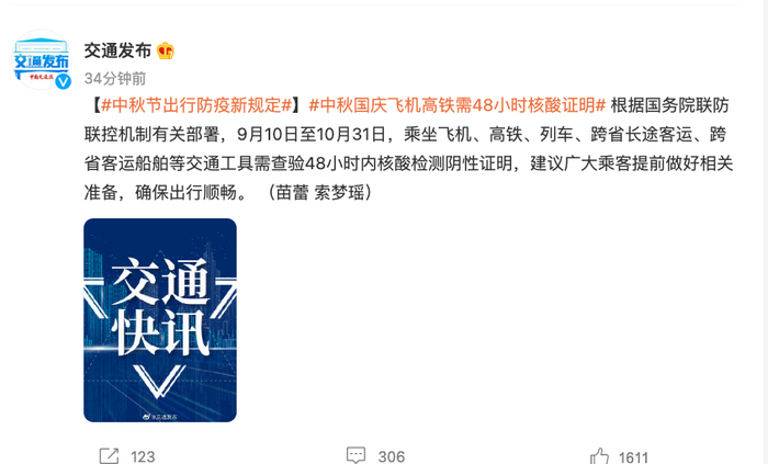 不过出行方面仍需做好个人防护,遵守相关防疫规定。据@交通发布,根据国务院联防联控机制有关部署,9月10日至10月31日,乘坐飞机、高铁、列车、跨省长途客运、跨省客运船舶等交通工具需查验48小时内核酸检测阴性证明,建议广大乘客提前做好相关准备,确保出行顺畅。