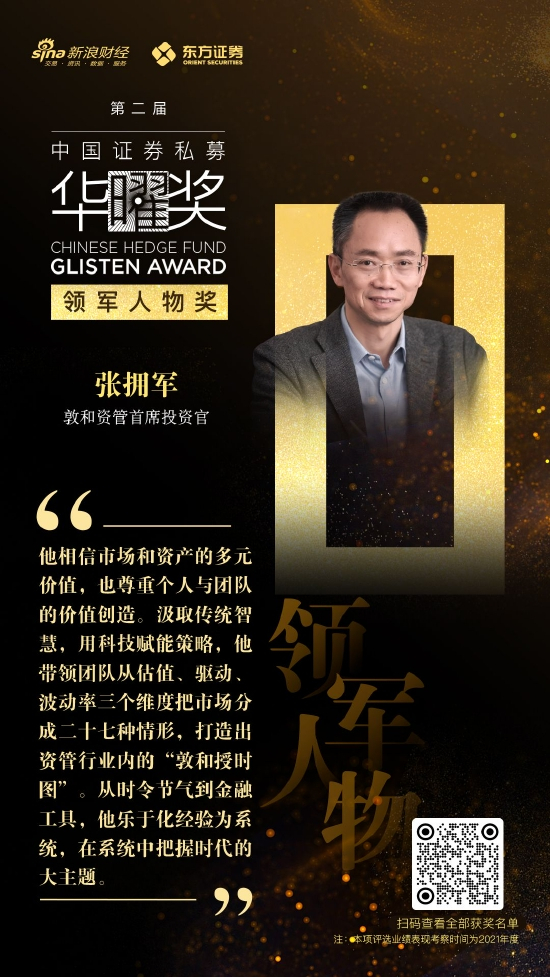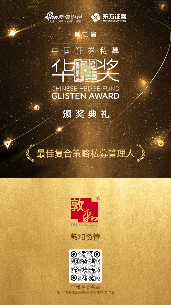 9月8日,由新浪财经和东方证券联合主办的第二届中国证券私募华曜奖在上海举办颁奖典礼。评选自2021年12月1日启动报名,共收到77家证券私募报名参评,15位评委贡献定性评价选票。其中,敦和资管首席投资官张拥军荣获“年度领军人物”奖。于此同时,敦和资管荣获华曜奖“最佳复合策略私募管理人”奖。(注:本奖项考察期间为2021年1月-12月)