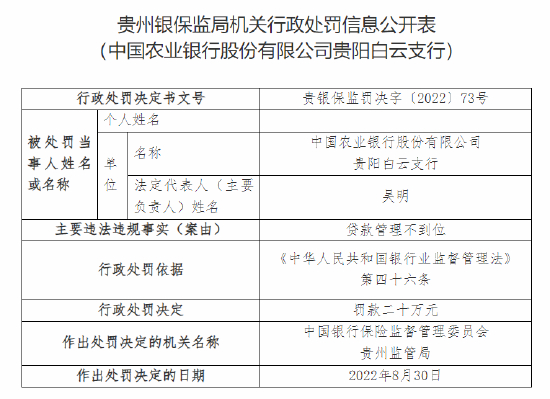 此外,中国农业银行股份有限公司贵阳白云支行同样因贷款管理不到位,被处以罚款二十万元;该支行吴明因对上述行为承担管理责任,被处以罚款五万元。