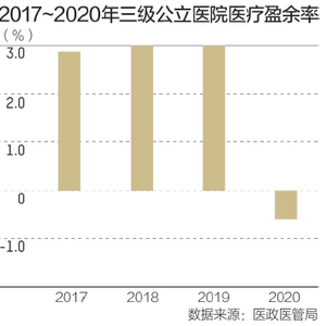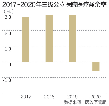 成绩单还显示,2020年,二级公立医院医疗盈余率平均为-0.66%,较2019年下降2.73个百分点;全国三级公立医院医疗盈余率为-0.6%,较2019年下降3.6个百分点。