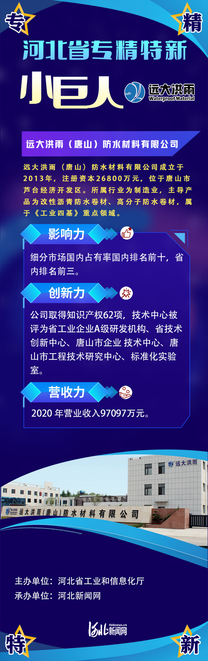 为展现河北省专精特新“小巨人”企业风采,日前,河北省工业和信息化厅中小企业处联合河北新闻网推出河北省专精特新《小巨人“亮绝技”》系列报道,本期“亮绝技”的小巨人企业是远大洪雨(唐山)防水材料有限公司。