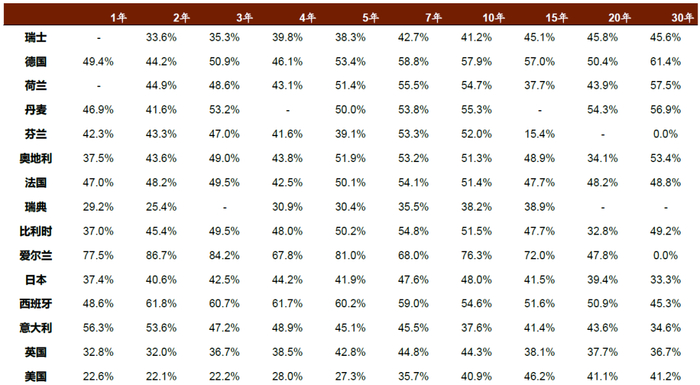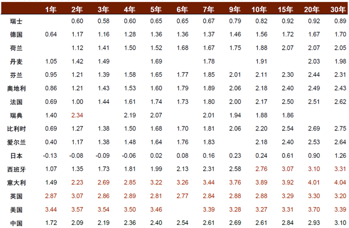 资料来源:Wind,中金公司研究部;备注:瑞士数据均从2007年3月2日起,荷兰15年从2006年2月15日、20年从2003年8月26日起,奥地利1年从2008年4月3日、20年2005年5月19日起,芬兰1年2005年2月21日、5年从2007年10月12日、15年从2010年1月6日、30年从2012年6月29日起,法国1年从2002年12月16日起,瑞典1年从2008年8月11日起、其余期限均从2007年1月12日,比利时1年从2003年1月20日起,爱尔兰3年从2002年9月10日、7年从2003年11月6日、15年2002年10月18日、30年从2015年2月5日起,西班牙1年从2011年8月8日、20年2007年4月10日起,意大利1年从2002年12月16日、15年2002年2月14日、20年从2003年2月4日起,其余国家2年自2006年3月1日起,4年自2005年11月10日起,1年、3年、5-30年均从2002年1月1日起,数据截至2022年9月1日