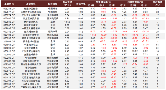 具体来看,今年以来,由于美国货币政策受通胀压力影响快速收紧,且疫情等因素扰动下经济预期偏弱,美元债资产整体下跌,其中投机级美元债下跌幅度明显更大,因而高收益债券(评级在BBB-以下)市值占资产净值比重较高的基金总整体而言表现也越差。此外,新兴市场债市受美国货币政策影响较大,因此业绩表现亦不佳;而中国境内人民币债市则稳中向好,中国概念类基金通过积极调仓,低配境外债券等方式获得了不错的超额收益率。