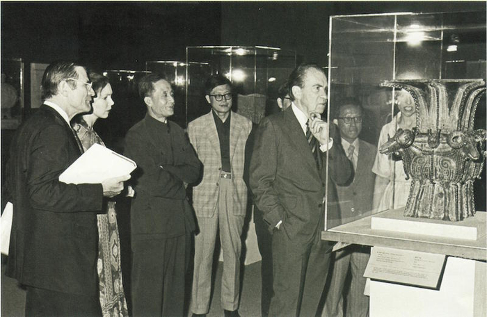 1980年2月,时任随展组组长的马承源陪同美国第37任总统尼克松参观在美国纽约大都会博物馆举办的“伟大的中国青铜时代”展览