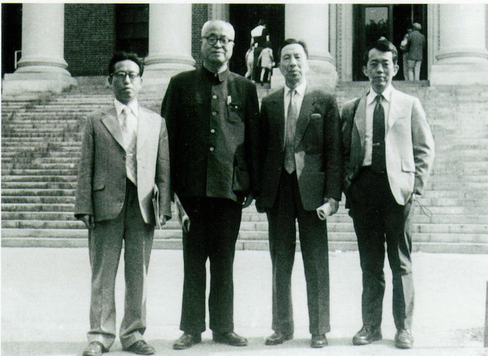 1980年6月,马承源(左一)参加美国纽约大都会博物馆召开的“中国青铜时代学术讨论会”,与张政烺(左二)、张光直(右一)、夏鼐(右二)在哈佛大学图书馆前合影