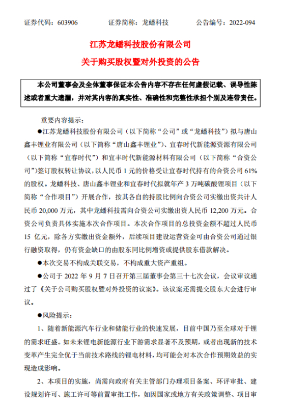 9月7日晚间,龙蟠科技(603906)、唐山鑫丰锂业有限公司、宜春时代新能源资源有限公司(简称“宜春时代”)和宜丰时代新能源材料有限公司(简称“合资公司”),在福建宁德签订了《关于宜丰时代新能源材料有限公司之股权转让协议》,龙蟠科技、唐山鑫丰锂业和宜春时代拟就年产3万吨碳酸锂项目开展合作。