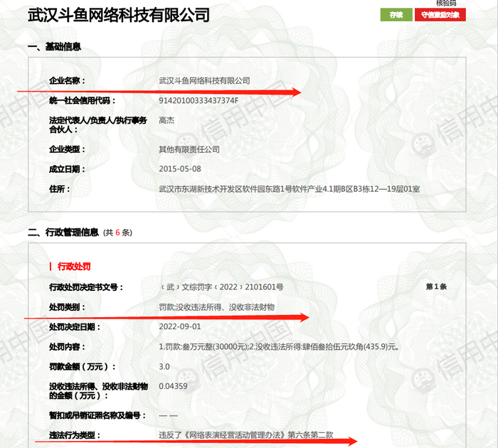 未来网记者从信用中国官网上查询到,武汉斗鱼网络科技有限公司(以下简称“斗鱼”)在今年9月1日被武汉市文化和旅游局罚款3万元,并没收违法所得435.9元。