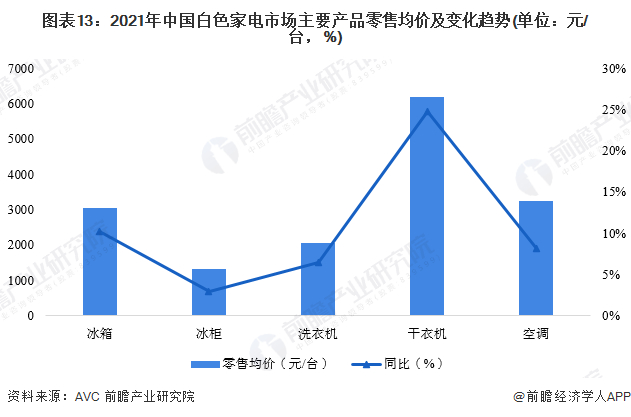 2021年,由于上游原材料价格上升,企业成本增加,中国白色家电主要产品价格均有所上涨。其中,冰箱零售均价为3046元/台,同比增长10.2%;冰柜零售均价1330元/台,同比增长3.0%;洗衣机零售均价2060元/台,同比增长6.4%;干衣机零售均价6182元/台,同比增长24.7%;空调零售均价3257元/台,同比增长8.2%。