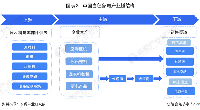 白色家电产业链上游为原材料及零部件供应,主要涉及压缩机、电机、电加热器、家用阀件、家电外壳材料等;中游为白色家电整机制造企业,主要为空调整机制造、冰箱整机制造及洗衣机整机制造;下游为销售端,主要分为线上销售渠道和线下销售渠道。