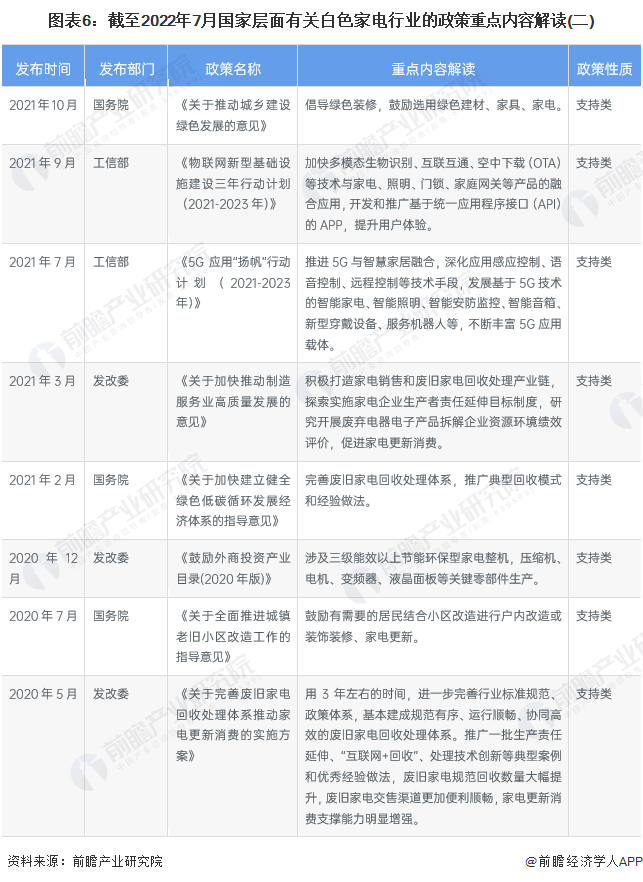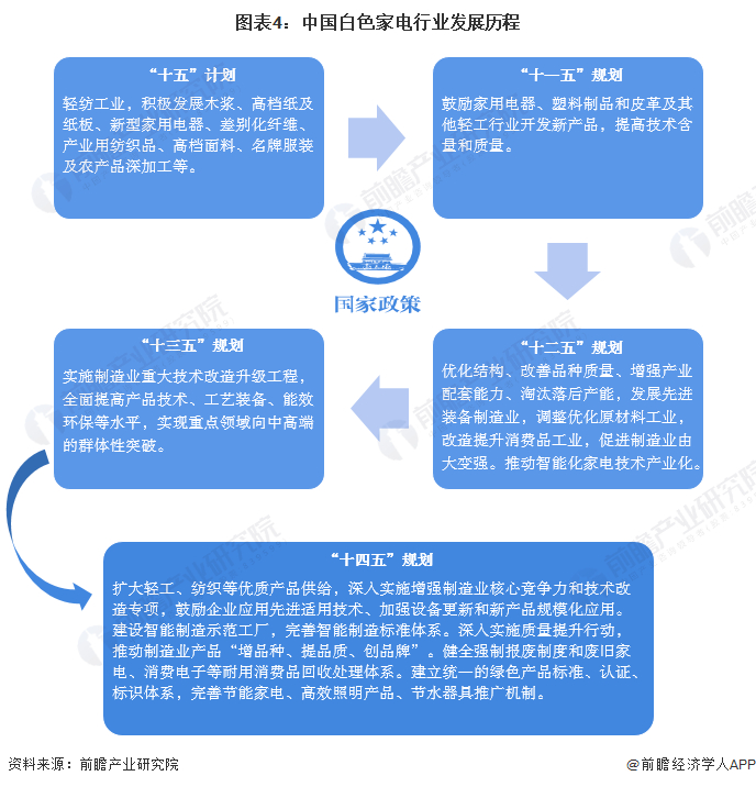 从中国国民经济规划中白色家电相关政策演变来看,“十五”计划期间提出,积极发展新型家用电器;“十一五”期间提出,鼓励家用电器行业开发新产品,提高技术含量和质量;“十二五”期间则提出,推动智能化家电技术产业化;“十三五”期间提出,制造业实现重点领域向中高端群体性突破;“十四五”期间指出,实现家电行业智能化、高端化、绿色化发展,尤其在绿色化发展方面指出,健全废旧家电回收处理体系,建立统一的绿色产品标准、认证、标识体系。从政策历程来看,我国白色家电行业经历了规模化、科技化、高端化、智能化、绿色化的发展历程,行业整体发展路径明确,发展状况良好。