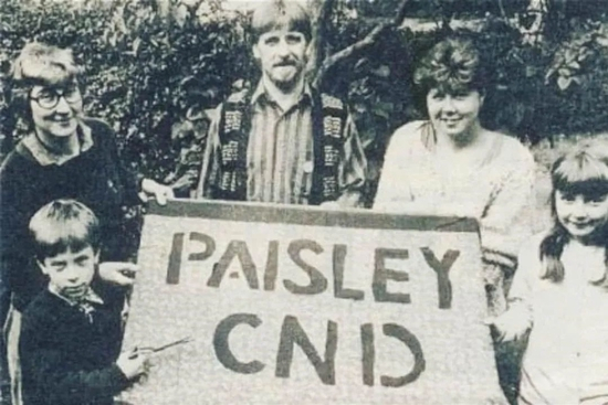 母亲带着两个孩子走过了不知道几个街区,终于来到了集会的现场——一个中心小广场。虽然他们来晚了,但是游行并没有开始,广场上面挂着几条横幅,上面写着“核裁军运动佩斯利分会”。
