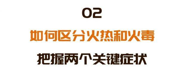 火热的症状:咽干舌燥、面红目赤、胸腹灼热、口渴饮冷、小便短赤、大便秘结火毒的症状:咽燥声嘶、鼻衄出血、牙疼肿胀、疖肿四起、烦躁失眠、口腔糜烂、发热出汗、痴抹糊多(眼睛分泌物多)、面色晦暗。
