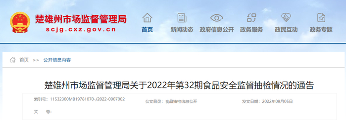 云南省楚雄州市场监管局发布2022年第32期食品安全监督抽检情况