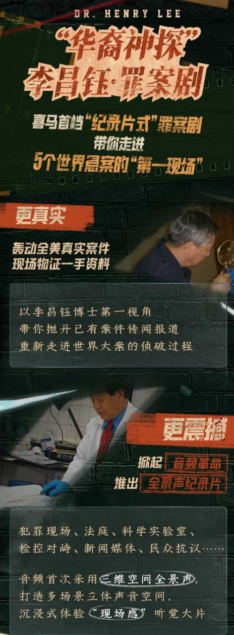 《“华裔神探”李昌钰·罪案剧》由喜马拉雅原创出品,是喜马拉雅首档原创自制罪案悬疑有声剧,也是全美第一位"华裔神探"李昌钰博士首次与国内音频平台合作的音频专辑,是国内首部李昌钰IP纯原创精品罪案有声剧。 这张专辑由李昌钰博士夫妇亲自参与监制,基于李昌钰博士参与鉴识的5个世界级大案,创作一系列具有纪实感的罪案故事,首次公开一些全球大案、疑案的鉴证细节和案件证据,还原要案“第一现场”,带领用户倾听真相。而菁彩声(Audio Vivid)带来的声音效果,使专辑内容在播放时表现出极强的空间感。专辑中的检控对峙、民众抗议、新闻报道等,通过三维空间菁彩声传播,增强了听众“亲临现场”的沉浸感。