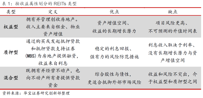 按照收益属性进行划分,美国通常将REITs产品分为权益型、质押型和混合型。权益型和质押型各有优劣势,为投资者带来的风险和潜在回报也有所差异。其中,权益型REITs收益主要来源于底层资产的利润,具备资产增值想象空间,属性偏股;质押型REITs则与债券基金更相似,收益主要来自于利息收入,因而风险相对权益型REITs低;混合型REITs综合了权益型与质押型的特征,收益和风险均介于二者之间。