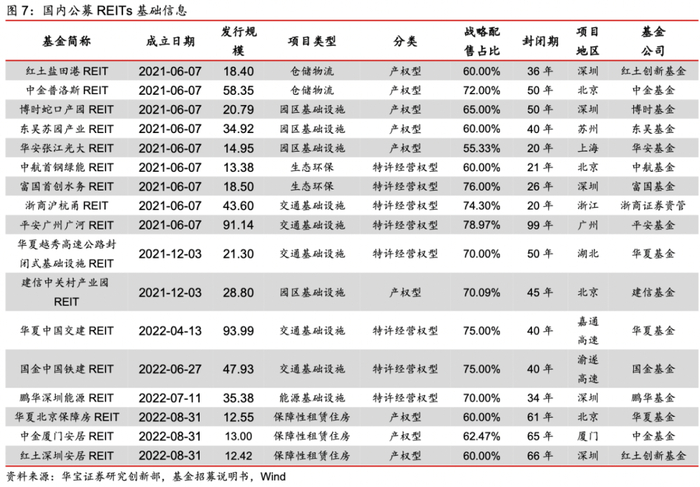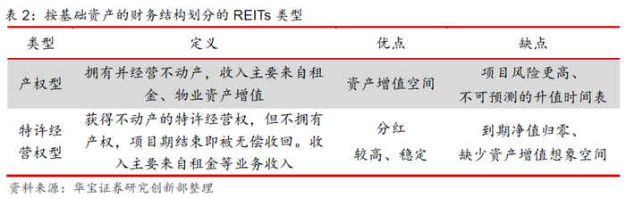 按照底层资产的法律属性进行划分,目前国内可将REITs分为产权型和特许经营权型,两者具备明显差异。其中,产权型REITs拥有底层资产的产权,在项目到期后可获得相应的资本增值收入,但也要承受资产价值下跌的风险,常见的产权型REITs项目有产业园、仓储物流等;特许经营权型REITs只拥有不动产的特许经营权,项目期结束时底层资产即被无偿收回,但每年较高的分红补偿了基金到期净值归零的损失,常见的特许经营权REITs项目有高速公路、污水处理等。