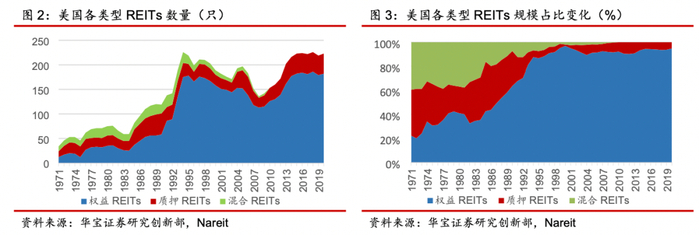 从美国REITs市场的数量和规模看,截至2020年末,美国共有223只REITs,合计规模1.25万亿美元。其中,权益型占绝对主导地位,共有182只,占比 81.6%,规模1.18万亿美元,占比 94.8%;质押型 REITs 共 41 只,占比 18.4%,规模为650.4 亿元,占比 5.2%;而混合型REITs早在2010年就已经不占据任何的市场份额,至今也再无新发产品,市场完全被权益型和少量的抵押型REITs挤占。观察历史数据,可以看到质押型和混合型REITs在早期发挥了重要作用。1990年代在亚洲金融危机的影响下,美国房地产行业受到重挫,推动许多房地产公司选择成为上市REITs获得融资。因而1991年也标志着权益型REITs时代的开始,市场主要力量由质押型REITs为代表的相对较小的公司集合向权益型REITs组成的更大集合升级。(Nareit数据)