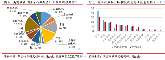 从投资领域看,根据FTSE Nareit All Equity REITs指数成分的最新数据,基础设施、住宅和工业地产是美国权益型REITs投资规模最大的三个行业,分别占比17.12%、15.99%和12.91%。在数量方面,前期美国以零售、住宅REITs为主要发展方向,但随着产业结构的升级优化,这些传统房地产项目逐渐减少,而一些倾向于特定功能的细分领域得到大力发展,比如数据中心、基础设施、林地和康养物业等。基础设施和工业地产REITs数量并不多,但占据了较大的规模份额,开发成本较高的特征使得这两类项目吸收的资金量相比其他项目更为庞大。