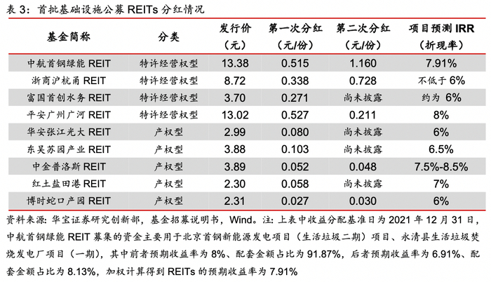 国内规定基础设施REITs在符合条件的情况下每年收益分配不得少于1次,但对分红上限并没有作要求,分红收益率与底层资产的类型、发行价、发行份额和运营情况息息相关。首批基础设施公募REITs自成立以来已逾一年,也陆续与基金持有人分享2021的利润。截至2022年9月2日,有5只REITs已根据2021年的利润实现了两次分红,剩余4只进行过一次分红,其中单次分红最高的情况出现于中航首钢绿能REIT第二次分配的1.16元/每份额。整体看,特许经营权类公募REITs的分红金额明显高于产权类公募REITs,这是因为特许经营权类项目到期价值归零,到期无法获得资产处置损益,因此基金存续期间提供给投资者的分红率偏高;而产权类项目拥有不动产的产权,未来具备增值空间,因此每年分红金额偏低些。尽管直观上产权类REITs获得的分红收益较低,但全周期真实收益率的衡量应当考虑到期资产的变现价值,根据各产品在招募说明书中披露的预计内在收益率IRR(折现率)来看,首批基础设施公募REITs产品的全周期IRR(折现率)均分布于6%-8%之间。