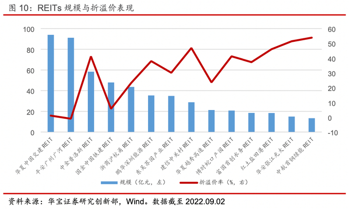 从REITs折溢价表现看,截止2022年9月2日,多数产品的价格相比发行价都有所上升,其中中航首钢绿能REIT的溢价率最高,达到53.86%;平安广州广河REIT是唯一跌破发行价的产品,折价率为-0.98%,一方面该产品流通盘相对较大,炒作动力不及其他产品;另一方面由于其底层项目广河高速属于交通运输类型,疫情以来周边城市经营活动和居民活动受限,通行费收入受到较大的影响,2021年度分红不及预期使得市场对其的投资情绪不高。结合基金规模来看,大规模的REITs溢价表现整体不如中小规模的产品。