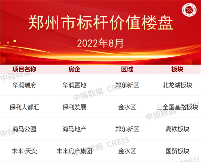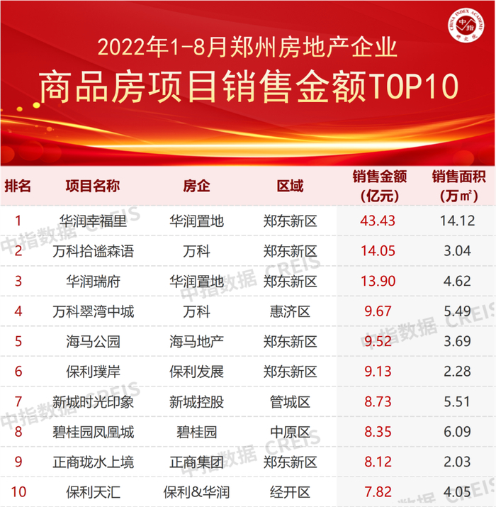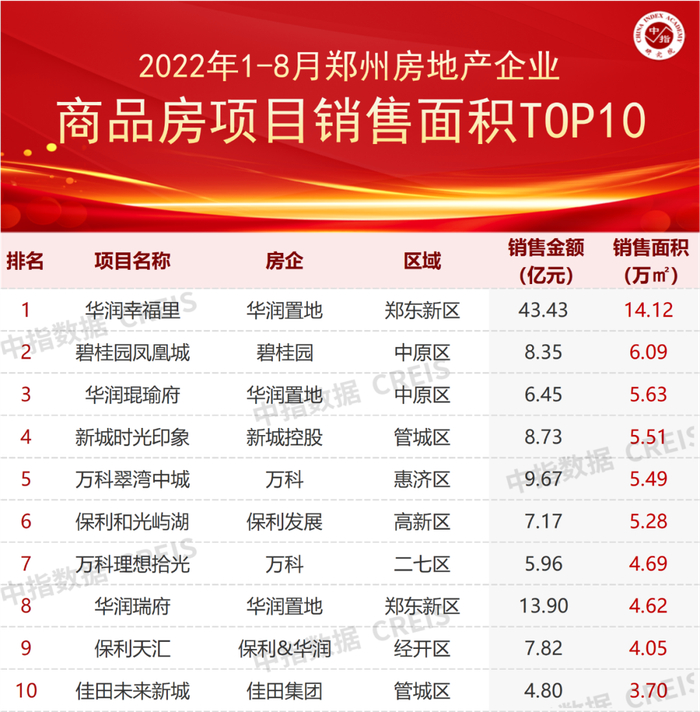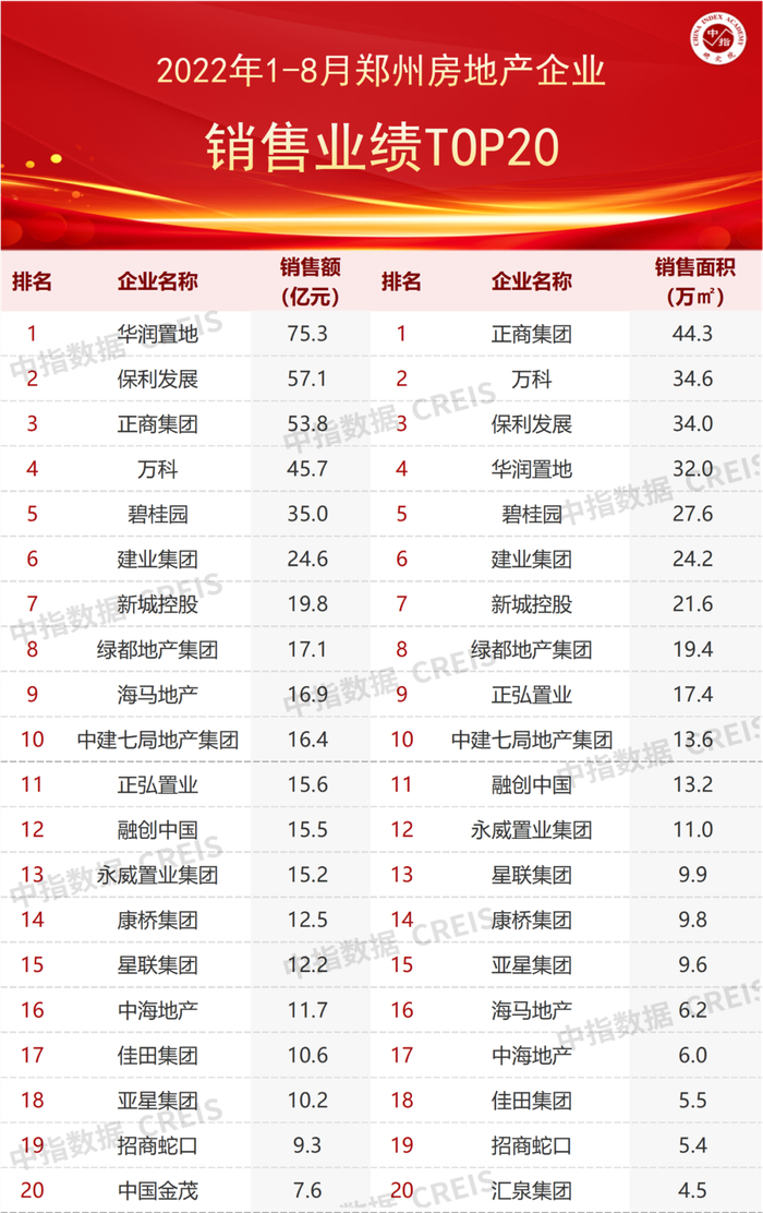 特别声明:各房企项目销售数据统计是以2022年1月1日-8月31日期间销售的商品房为统计口径,包括商品住宅、写字楼、公寓、商业全口径,主要依据中指数据CREIS(点击查看)在郑州市域范围的销售监测数据,并参考当期总体经营情况和推盘去化情况进行分析统计;对于少数没有在监测范围内的项目,由企业提供相关文件,经审核,也纳入统计范围。本报告仅供参考,不对使用报告及其内容所引发的任何直接或间接损失承担责任。