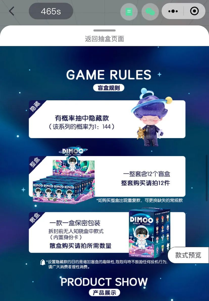以泡泡玛特的Dimoo太空旅行系列为例,泡泡玛特官方小程序“泡泡玛特抽盒机”显示,该系列定价为59元,整套有12个常规款盲盒,此外还有一个隐藏款,隐藏款的抽中概率为1:144。