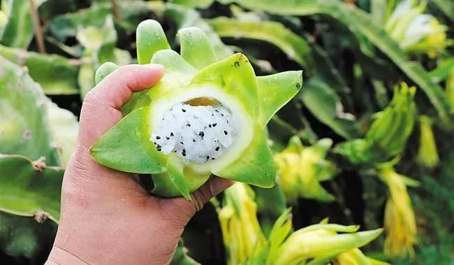 阳光下的澄海溪南镇六合围火龙果基地生机盎然,火龙果植株的枝干,形似仙人掌的绿色藤条,整齐茁壮,在成人巴掌大的火龙果花灿烂盛开之后,枝头陆续成批挂上饱满诱人的火龙果,像一个个小灯笼,红的,还有黄的。黄色火龙果代表吉祥如意,如今已成为市场新秀。喜欢火龙果的人们都知道,红火龙果有红肉和白肉两种,白的清甜,红的香气馥郁。而黄龙果的果肉也是白色的,成熟度高的黄龙果,果肉有如同荔枝的淡淡香气,非常特别。据了解,黄龙果源自农业强国以色列,是火龙果中的高端品种。