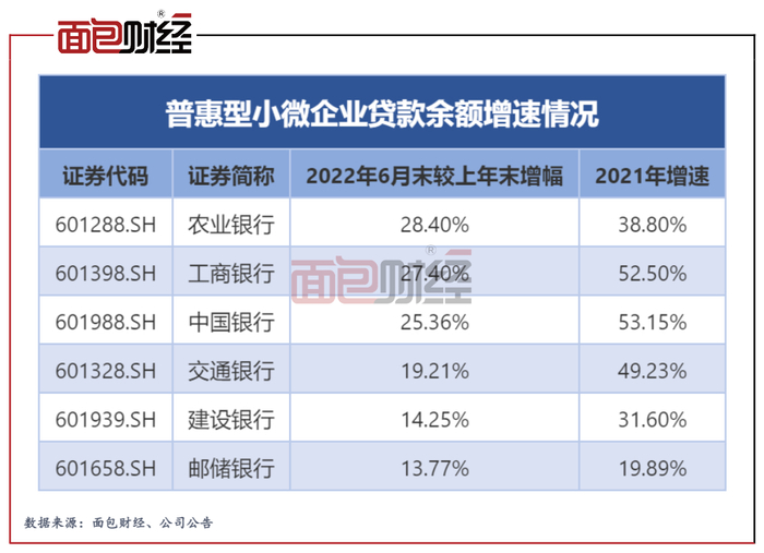 邮储银行2021年的贷款增速也是最低。数据显示2021年,六大行中仅邮储银行的普惠型小微企业贷款增速低于20%,为19.89%;其他银行披露的贷款增速均在30%以上,工行和中行甚至超过50%。