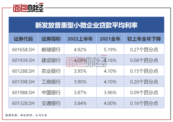 2022年中报数据显示,截至2022年末,国有六大行的普惠型小微企业贷款较上年末均有增长,利率均有下降。六大行平均利率从上年的4.25%下降到4.09%。