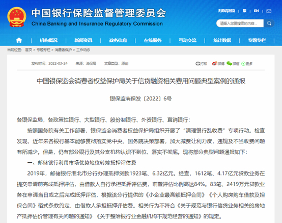银保监会官网的通报显示,2022年3月,银保监会消保局曾经发布《关于信贷融资相关费用问题典型案例的通报》,通报了多家银行违规收费相关问题。其中包括了“邮储银行利用市场优势地位转嫁评估费”相关案例的通报。