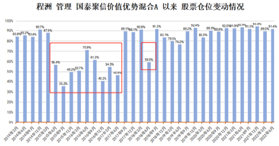 从程洲历史上的仓位变化中,也能体现他的大局观能力。他曾经在2015年6月市场调整前,及时降低仓位,又在2016年四季度市场低迷时,保持了较低仓位,在2018年的年中也通过降低仓位应对市场风险。