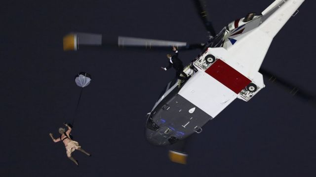 夜色中,飞机飞临开幕式举办地伦敦碗上空,滞留盘旋。邦德打开舱门,夜风阵阵。他正想请示,女王便第一个跳出轿厢——旋即,夜空中两朵硕大的“米字旗”伞花摇曳——现场,伴随着电子乐队,小号、圆号、长号、萨克斯齐鸣协奏出的“邦德序曲”,两人缓缓飘落在体育场草坪上。这,显然也是在致意007电影《海底城》中的经典桥段:片头,罗杰·摩尔饰演的007一路逃过追杀,从白雪皑皑的阿尔卑斯山脉一跃而下,同样硕大的米字旗伞花适时张开。不死英雄,又一次逃出生天。