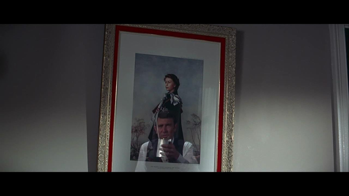 1969年《女王密使》剧照。乔治·拉扎比饰演的邦德举起酒壶向女王挂像致意。