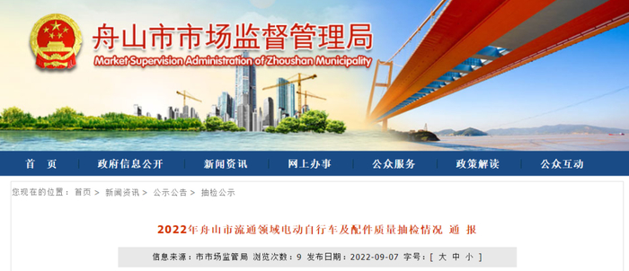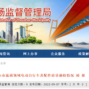 2022年9月7日,浙江省舟山市市场监督管理局网站通报2022年舟山市流通领域电动自行车及配件质量抽检情况。据通报,3批次电动自行车不合格。