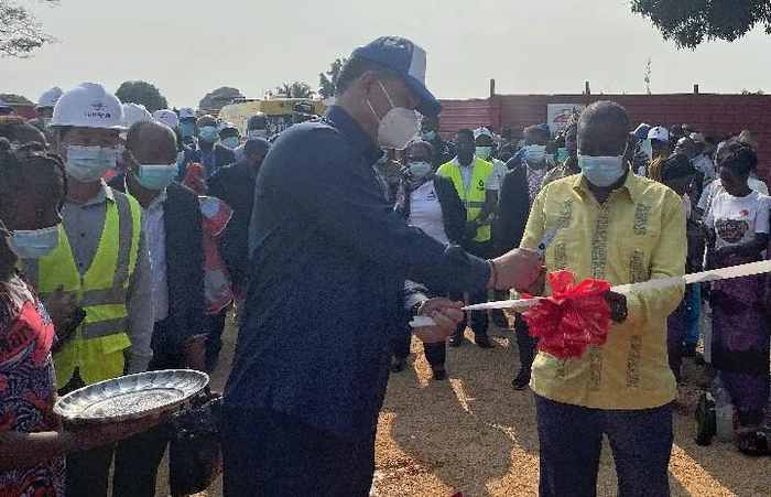 6月30日,在安哥拉卡宾达省供水项目现场,安能源和水利部部长博尔赫斯(前左)和卡宾达省省长尼温加在竣工典礼上剪彩。新华社发(中国铁建二十局集团供图)
