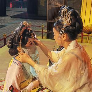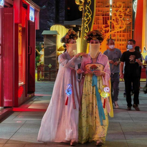 身穿襦裙,云鬓花颜,古装丽人手提玉兔花灯,在古风古韵的街市中浅吟低笑,徐徐穿行。在西安大唐不夜城景区,游客也可换上唐朝装扮,请景区的妆娘帮忙贴上传统花钿,结伴逛一逛挂满各式各样宫灯的街区,欣赏传统歌舞表演。