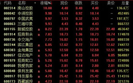 地产板块盘中强势拉升,截至收盘,南山控股、中洲控股、中国武夷、三湘印象等涨停,新城控股、招商积余、中交地产等涨约8%,金地集团、招商蛇口、保利发展涨超5%。
