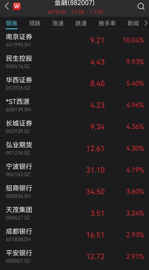 金融板块盘中集体拉升,Wind金融指数上涨1.7%。银行板块方面,宁波银行涨逾4%,招商证券涨3.6%,成都银行、平安银行涨约3%;保险板块方面,天茂集团涨逾4%,中国人寿、中国太保涨超2%;券商板块方面,南京证券涨停,华西证券涨5.4%,长城证券涨4.36%,中信建投、中信证券等涨超2%。