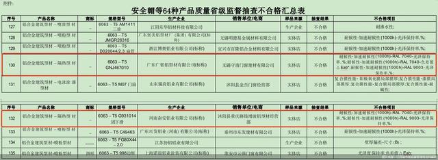 广铝、奋安被检不合格产品均为“铝合金建筑型材-隔热型材”。抽检结果显示,标称生产企业为“广东广铝铝型材有限公司”、销售单位/电商为“无锡守清门窗建材有限公司”、规格型号为“6063-T5 GNJ467010”、被检不合格项目为“耐候性-加速耐候性(1000h)-RAL 7040-光泽保持率,%;耐候性-加速耐候性(1000h)-RAL 7040-色差值△Eab*;耐候性-加速耐候性(1000h)-RAL 9003-光泽保持率,%”;标称生产企业为“河南奋安铝业有限公司”、销售单位/电商为“沭阳县重庆路钱增波铝型材经营部”、规格型号为“6063-T5 G931014 固下滑”、被检不合格项目为“耐候性-加速耐候性(1000h)-RAL 7040-光泽保持率,%;耐候性-加速耐候性(1000h)-RAL 9003-光泽保持率,%”。