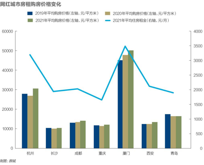 值得注意的是,虽然青岛购房价格偏高,租房价格却偏低,2021年为1,911元/月,仅高于七座城市中的重庆(1,666元/月),低于长沙(1,949元/月),但这三座城市的房租收入比在七座网红城市中都属最低,2021年均为0.2。2021年,厦门、杭州的平均住房租金均超过3000元/月,成都、西安刚刚2000元/月出头。