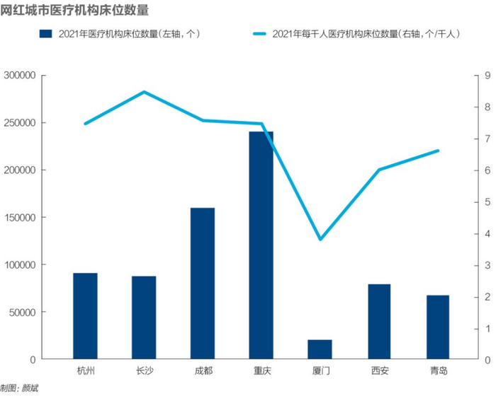 七座城市中,哪座城市就医住院更为方便?重庆是医疗机构床位数量最多的城市,2021年达到240,700个,这包括医院、社区卫生服务中心、乡镇卫生院等医疗机构的床位。其次分别是成都、杭州、长沙、西安、青岛、厦门,2021年分别为160,000个、91,000个、87,200个、79,500个、67,900个、20,253个。