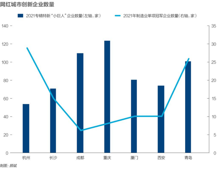 从创新科技企业数量看,七座城市中,杭州的国家高新技术企业、制造业单项冠军企业最多,2021年分别为10,251家、29家。重庆的专精特新“小巨人”企业最多,2021年达到124家。西安的科技型中小企业数量最多,2021年达到8,454家。成都的国家企业技术中心数量最多,2021年达到58个。七座城市中,长沙、厦门的国家高新技术企业数量偏少,2021年分别为4,330家、2,156家。